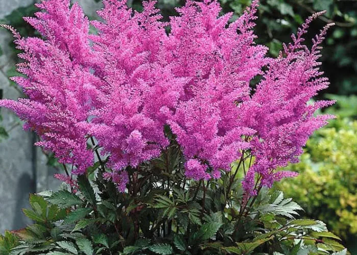 Цветение начинается в июле-августе и продолжается около 3–4 недель. Астильба Глория Пурпуреа образует густые, пушистые метельчатые соцветия насыщенного пурпурно-розового оттенка. Соцветия сохраняют декоративность даже после завершения цветения.