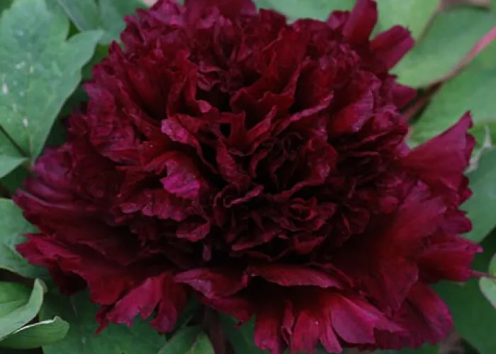 Пион древовидный Бао Гун Мянь — декоративный сорт с выразительными тёмными цветками и ранним обильным цветением. Куст среднерослый, слегка раскидистый, высотой примерно 100–120 см. Цветки крупные, около 16 × 7 см, густомахровые, чаще хризантемовидной формы, иногда напоминают розу. Окраска лепестков насыщенная тёмно-фиолетовая с лёгким почти чёрным оттенком. Лепестки постепенно уменьшаются к центру цветка, создавая плотную, многослойную структуру. Часть тычинок преобразована в лепестки, из-за чего соцветие выглядит более пышным, а мелкие пестики почти не заметны.
